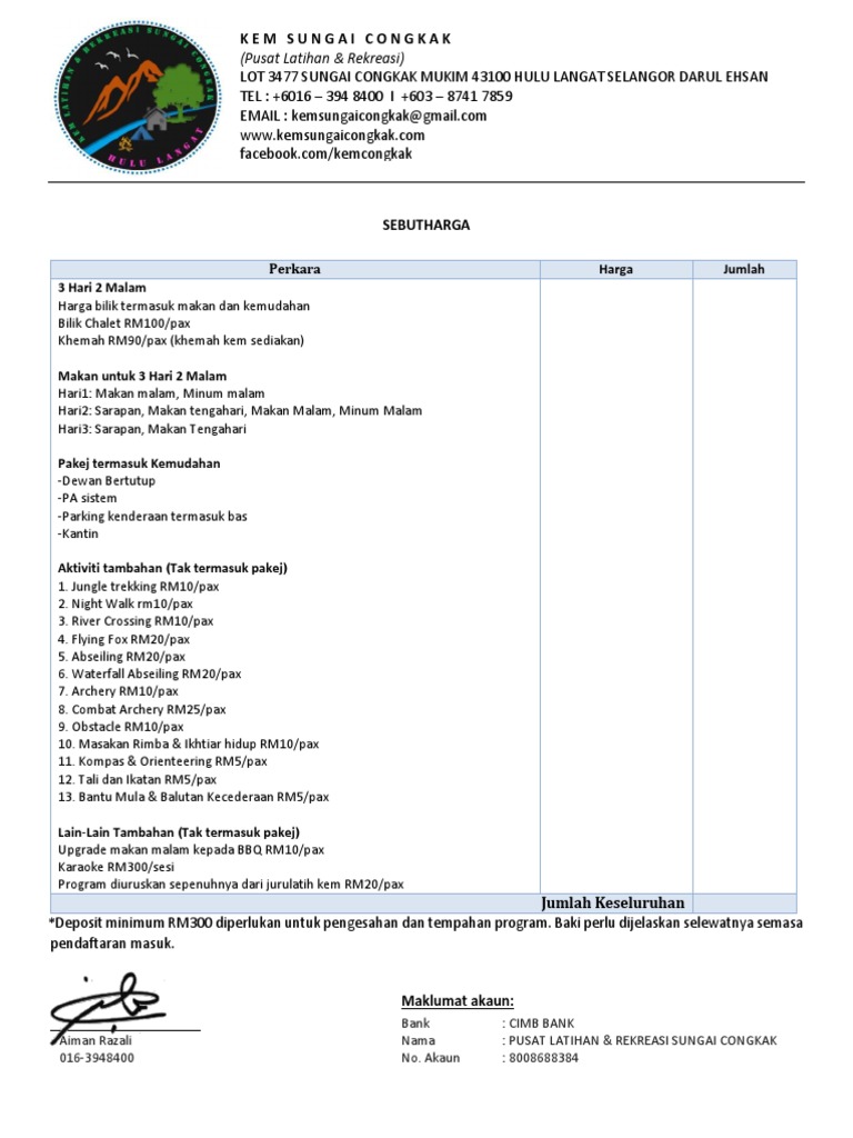 Senarai Harga Pusat Latihan Rekreasi Sungai Congkak
